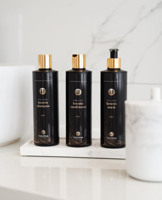 Ervaar de krachtige werking van onze exclusieve Deluxe Keratin Haircare-lijn,